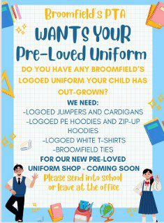 - From the Touchline Website – Royal blue PE hoodie or zip-up hoodie with school logo and ‘Broomfields’ on the back. This can also be purchased without the logo or Broomfields on the back for a more affordable price. We felt it was important to have a PE top with Broomfields on the back as this can be worn for school trips and any sporting events that you child may take part in and would prefer for the children to have these. If your child is in receipt of free school meals and you would like support in purchasing this hoodie, please contact school.