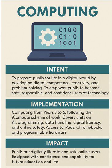 Computing is delivered through the iCompute scheme of work, which provides a comprehensive and progressive curriculum from Years 3 to 6. This scheme covers all aspects of the National Curriculum and includes units on Artificial Intelligence, programming, data handling, digital literacy, and online safety. Lessons are carefully sequenced to build on prior learning and develop pupils’ computational thinking, creativity, and collaborative skills.