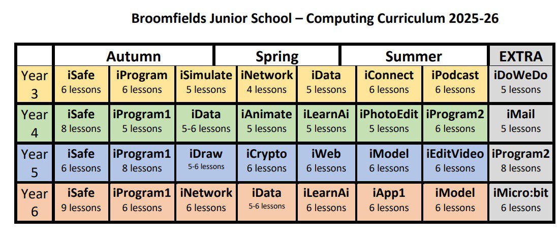At Broomfields Junior School, we recognise that technology is an integral part of everyday life and that children are growing up in a world where digital literacy is essential. Our Computing curriculum is designed to prepare pupils for life within and beyond school by developing high standards in digital competence, creativity, and problem-solving. We aim to foster independent learning and broaden pupils’ access to ideas and experiences through a rich and engaging Computing curriculum. By equipping pupils with the skills to navigate and contribute to a rapidly evolving technological landscape, we empower them to become safe, responsible, and confident users of technology.
