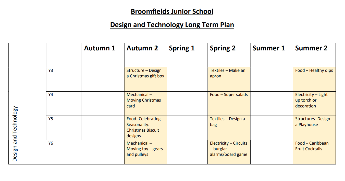 At Broomfields Junior School the teaching of Design Technology follows the National Curriculum through the use of the Design and Technology Associations, Projects on a Page. This will be taught in focussed blocks once per term in each year group.