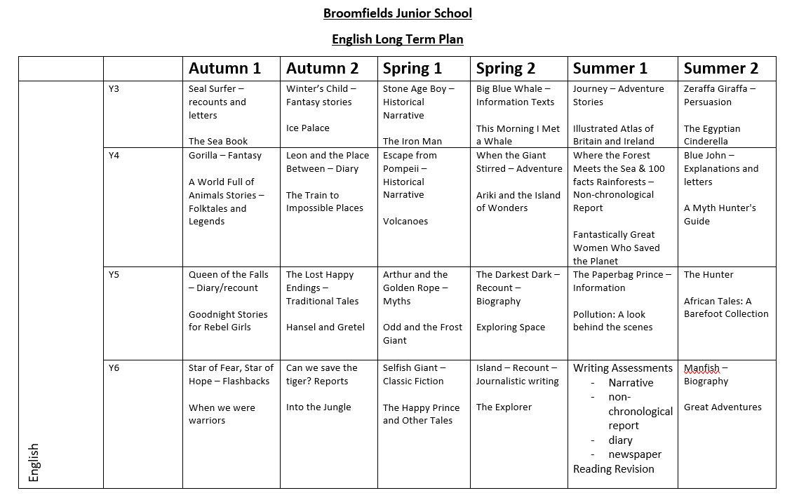At Broomfields Junior School, we believe that reading, writing and communication are at the centre of learning. We aim is to equip our children with these skills so that they can use them confidently and effectively, not only during their time at Broomfields, but also into their future.