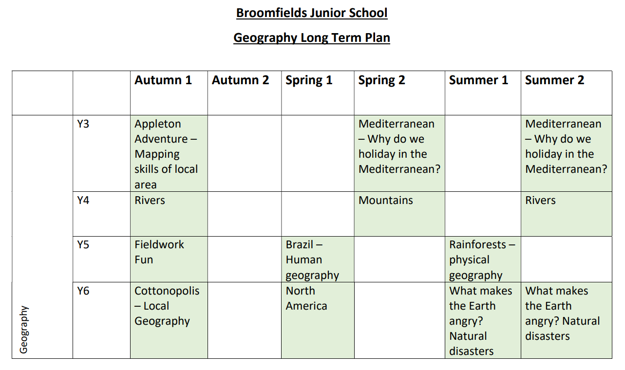 Geography is a valued part of the curriculum at Broomfields Junior School as it provides a means of exploring, appreciating and understanding the world in which we live and how it has evolved.