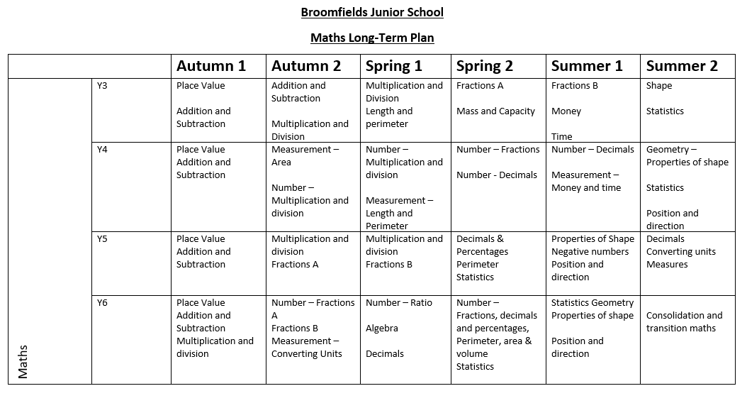 At Broomfields Junior School we think Maths is magnificent! Mathematical teaching and learning here reflects that maths happens all around us in real life. We recognise and value the importance of a well- rounded Maths curriculum which every child can access at their individual starting point. We fully embrace and understand that every child has differing learning styles and needs and within the subject of Maths it is imperative that every child is developed, enriched and challenged within the mathematics lesson.