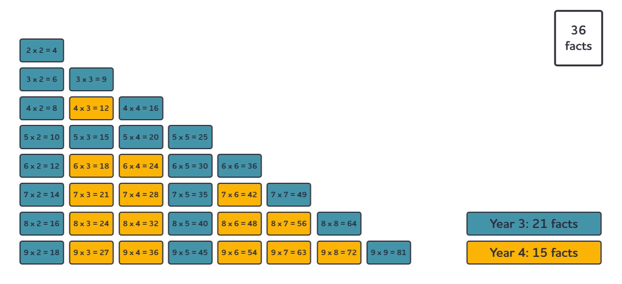 The children will learn the 36 key times tables facts to support with their times table knowledge. You can practise these with your child to help them with their knowledge.