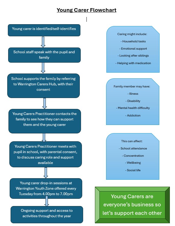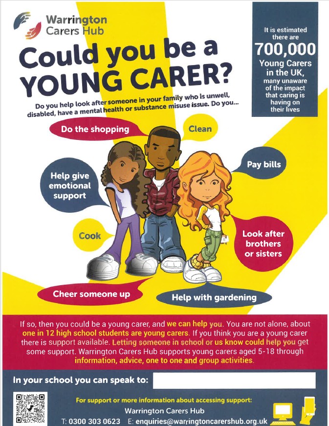 We support Young Carers in school and also work closely with the Young Carers Team at Warrington Carers Hub.Â
